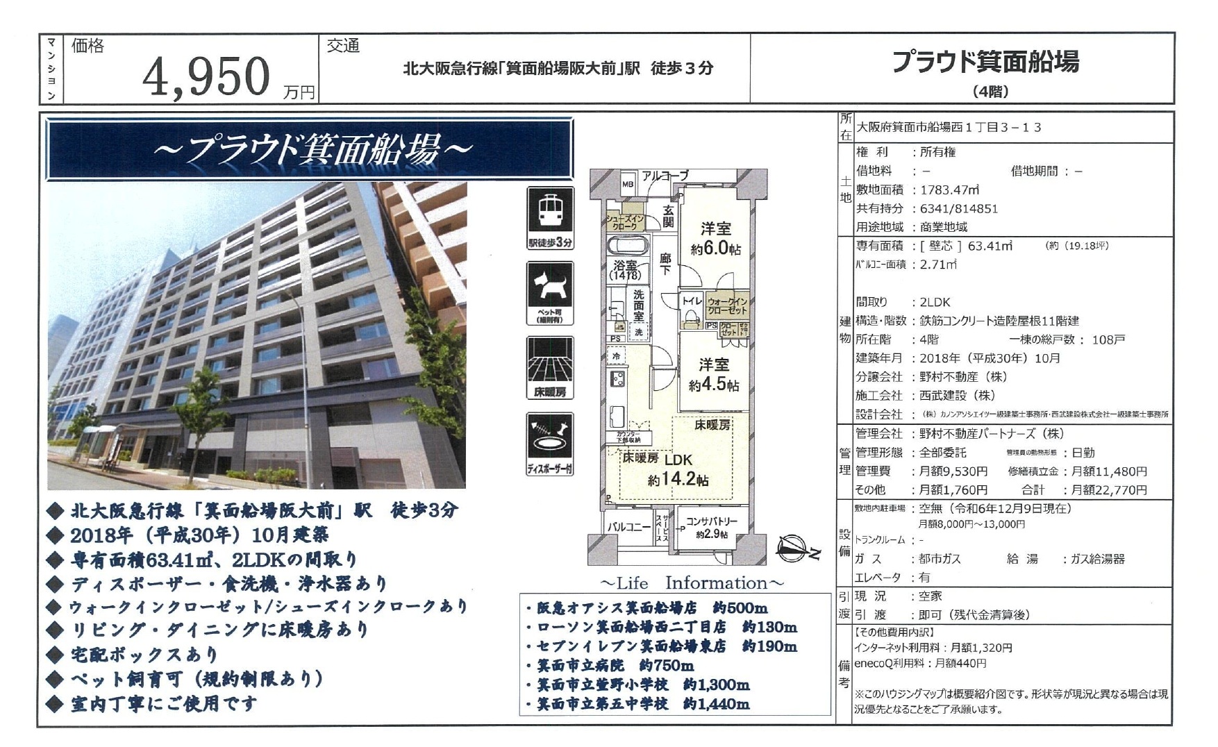 小野原東6丁目・箕面小野原パーク・ホームズ | 2,280万円 81.13㎡ 12.64㎡ |
